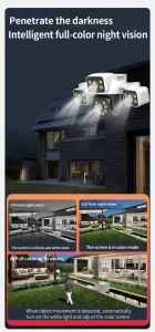 -3 image modes: Smart mode/Infrared mode/Color mode;White light timing start off function;Color mode: White LED light on, day and night are color vision.